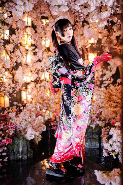 振袖、襦袢、伊達襟、帯、帯締め、帯揚げ、抱え帯、グローブ、着付け小道具一式